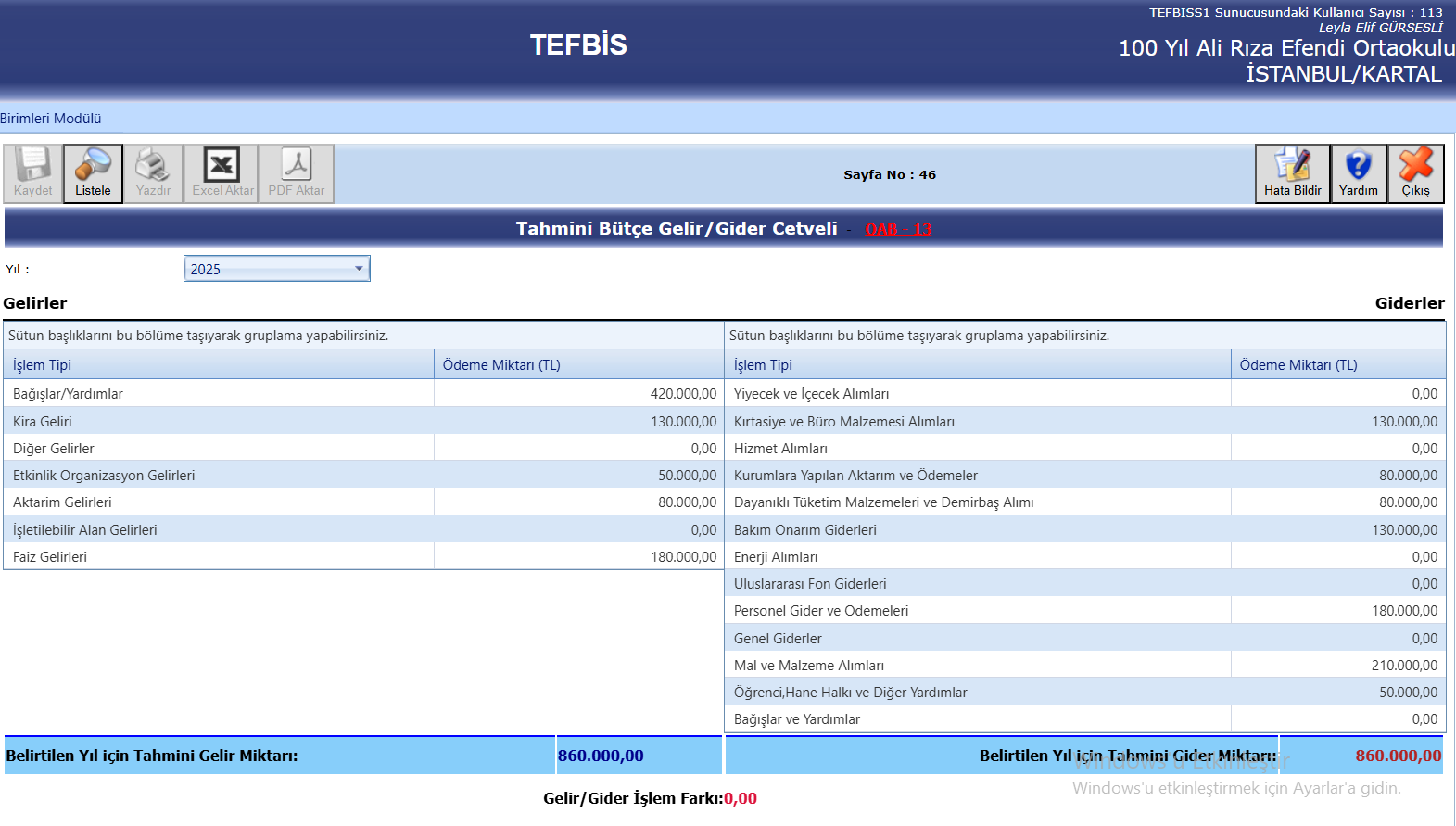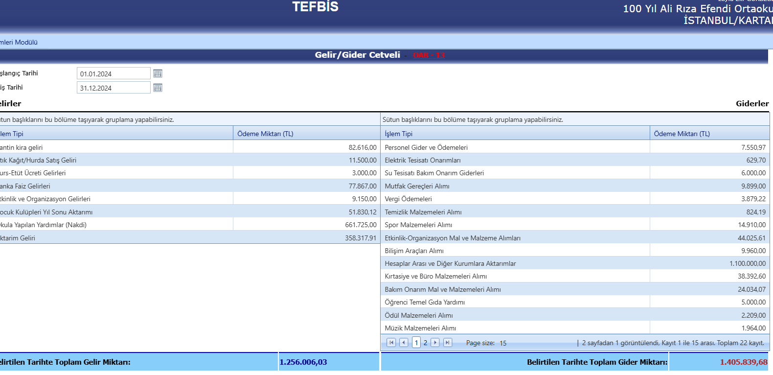 Okul Aile Birliği Gelir - Gider